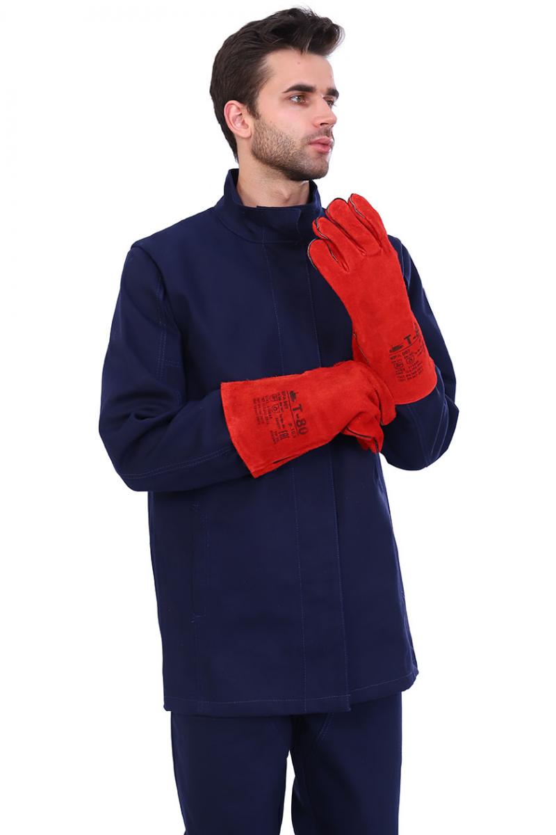 Спинка с настрочной кокеткой (кокетка двойная: из верха и из бязи). При настрачивании кокетки обрабатываются два вентиляционных отверстия. Срез кокетки обтачивается кокеткой из бязи. Огнестойкий СОП 5 см по кокетке. Рукава втачные одношовные, с усилительными накладками: центральная часть, передняя и локтевая накладка. Срезы локтевой и передней накладок заходят под центральную накладку. На средней части левого рукава знак защиты Тр.